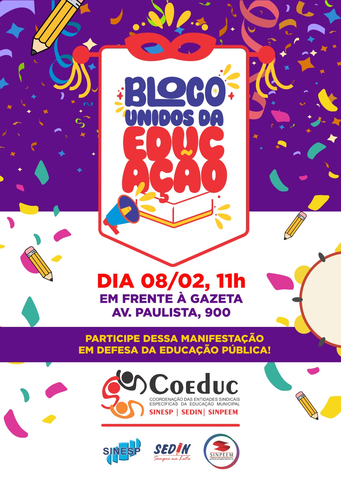 03/02/2026 - Bloco Unidos da Educação: ação cultural da Coeduc, em defesa da educação pública e estatal e de seus profissionais